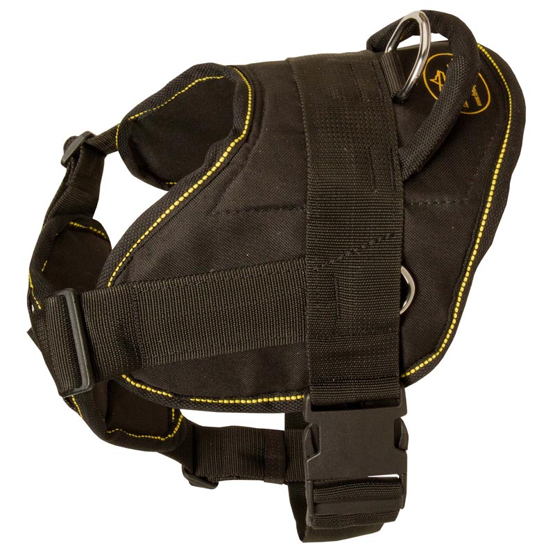 Get this Professional Training Nylon Harness. Innovative design - better quality, style and comfort. Nylon harness is with comfortable chest plate now! Even if he pulls too heavy cargo or resists your excessive pulling force the chest plate won’t cut into his skin. Due to nylon material this product is made of, it is strong, reliable and easy in use. It can withstand any weather conditions well and it's very easy in cleaning. Carefully stitched corrosion resistant D-rings won’t fall off when you walk your American Bulldog or exercise him. Adjustable at 4 various places, this harness fits 100% snug for your dog. Besides, when you do it, the harness can be put on and off by means of easy quick release buckle. Fast grab handle on the back plate, that serves for better control of the Amstaff, is stitched at the most comfortable place so you could reach out to it very quickly.