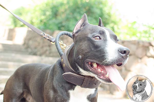 Extra Strong Agitation Leather Dog Collar with Handle for Amstaff